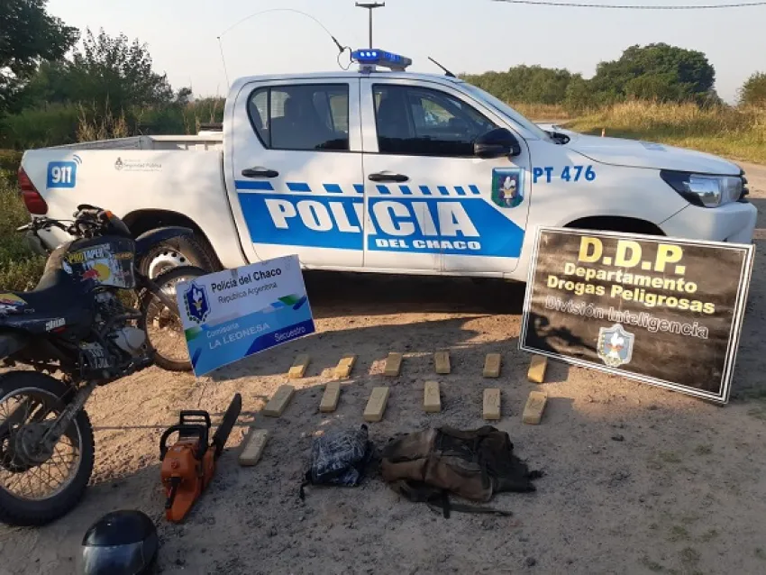 Rápidamente, los agentes realizaron un seguimiento y lograron demorar a los hombres a varios metros del control, que transportaban una motosierra y una mochila con 13 panes de marihuana.