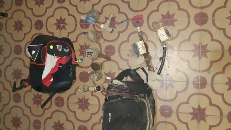 Dos agentes policiales motorizados observaron en el lugar a dos muchachos que huían de una casa, dejando a sus espaldas un gran charco de agua. Al seguirlos y alcanzarlos, requisaron dos mochilas y encontraron siete medidores de agua y un cuchillo tipo serrucho. Además, incautaron la bicicleta rodado 20 en la que se movilizaban.
