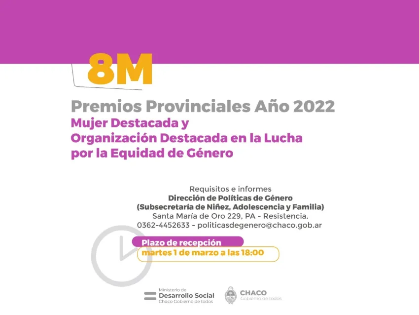 El Ministerio de Desarrollo Social, a través de la Subsecretaría de Niñez, Adolescencia y Familia, lanzó la convocatoria para postulantes a los Premios Provinciales 2022 en las categorías: Mujer Destacada del Año y Organización Destacada en la Lucha por la Equidad de Género. Las postulaciones se recibirán hasta el martes 1 de marzo.