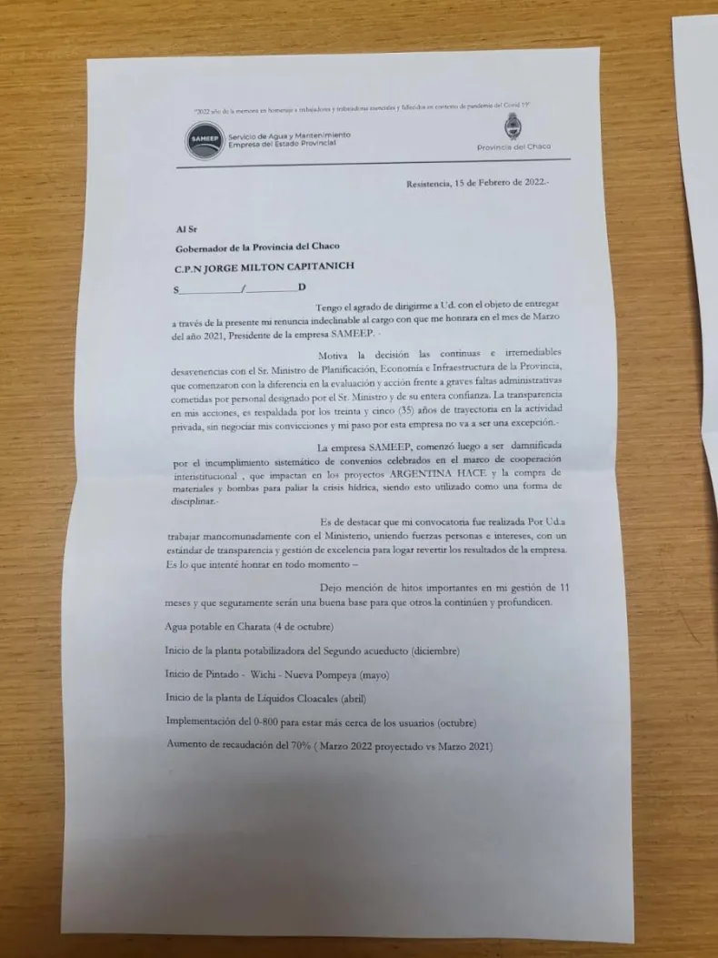 En la siesta de hoy se conoció la nota de renuncia que elevó al Gobernador Capitanich el presidente de la empresa Sameep. En la misma expone su decisión de abandonar el cargo que ocupa desde marzo del 2021, debido a diferencias de criterio con el actual ministro de economía Pérez Pons.