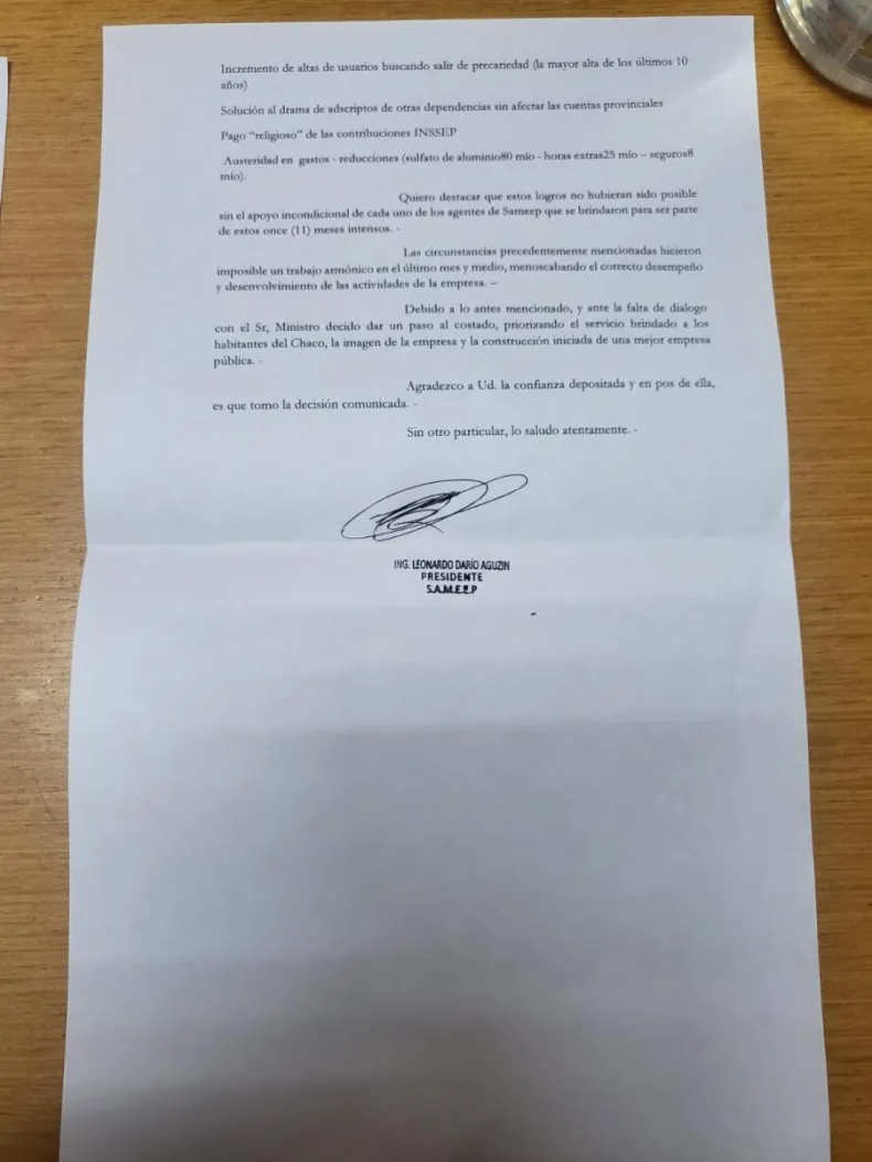 Finalmente, en el comunicado el ex funcionario sostiene que, "Ante la falta de dialogo con el Sr, Ministro decido dar un paso al costado, priorizando el servicio brindado a los habitantes del Chaco, la imagen de la empresa y la construcción iniciada de una mejor empresa pública".