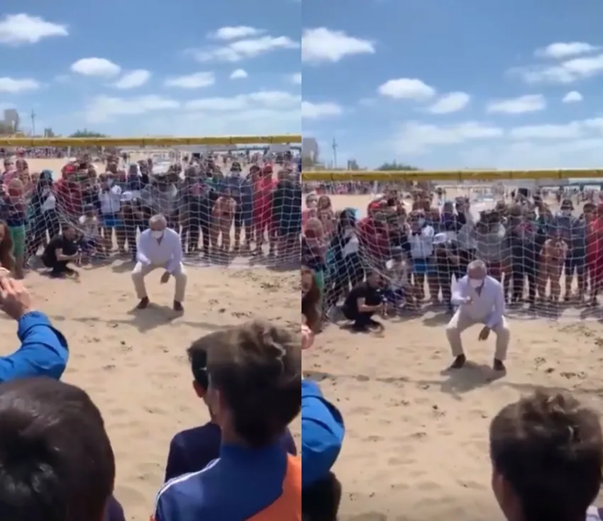 Durante su estadía en la playa Fernández se animó a jugar un rato al fútbol, en camisa, pantalones y zapatos, se puso debajo de un arco e intentó atajar un penal.