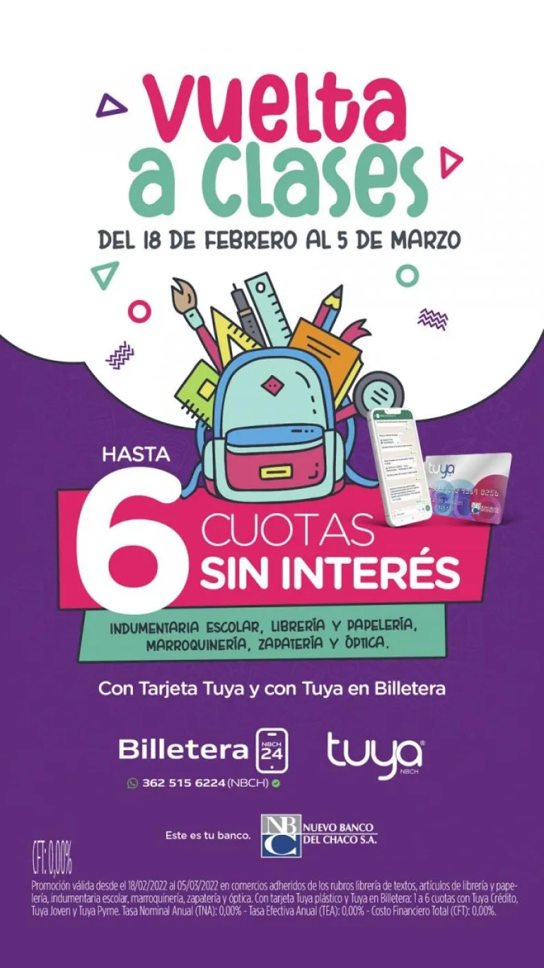 La promoción "Vuelta a clases" de Nuevo Banco del Chaco comienza este viernes 18 de febrero y se extenderá hasta el sábado 5 de marzo para comprar en hasta 6 cuotas sin interés con tarjeta Tuya y Tuya en Billetera.