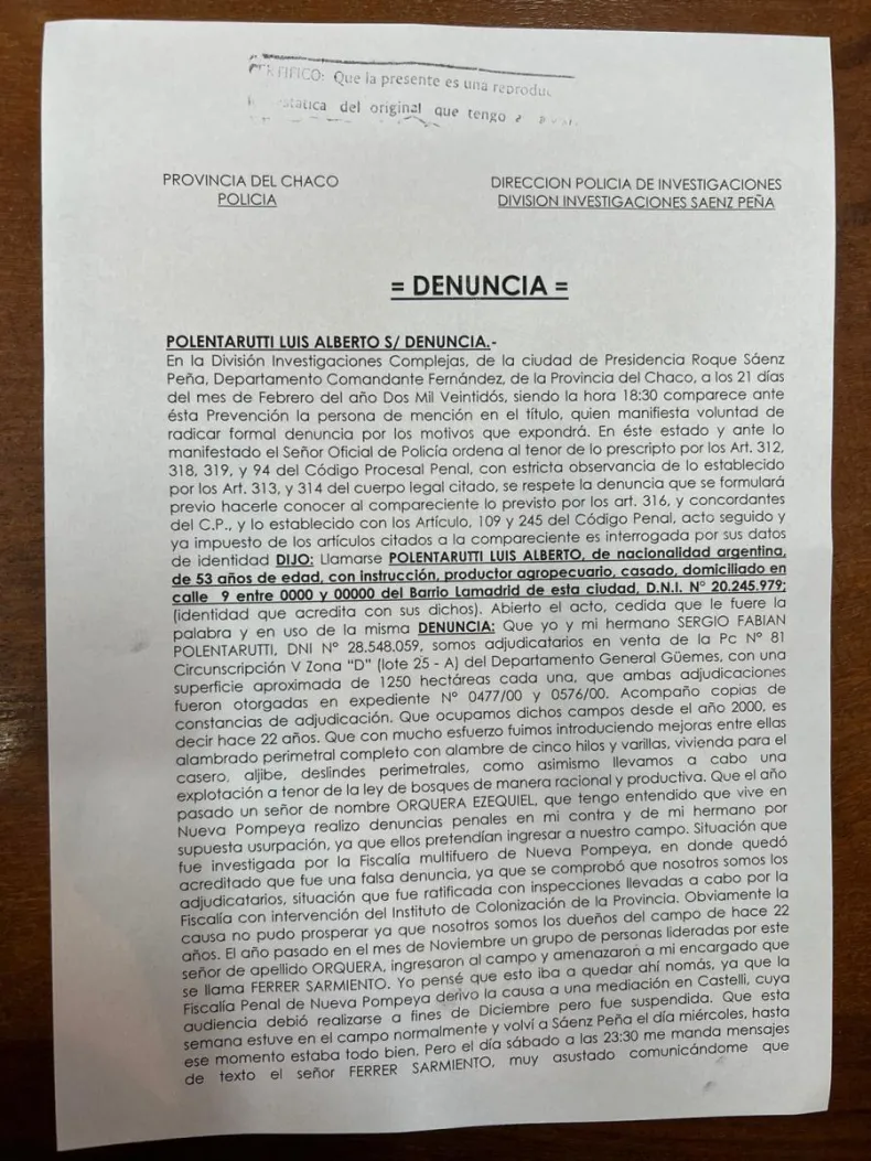 El pasado lunes 21 de febrero, aproximadamente a las 18.30 horas de la tarde, el productor agropecuario Luis Alberto Polentarutti junto a su hermano Sergio Fabián Polentarutti de la ciudad de Sáenz Peña denunciaron ante la Policía que una persona de nombre Ezequiel Orquera, quien vive en Nueva Pompeya, intentó usurpar un campo de su propiedad de 2500 hectáreas divididas en dos lotes de 1250 cada una ubicado en la parcela Nº 81 Circunscripción V Zona D del Lote 25 A del departamento General Güemes.