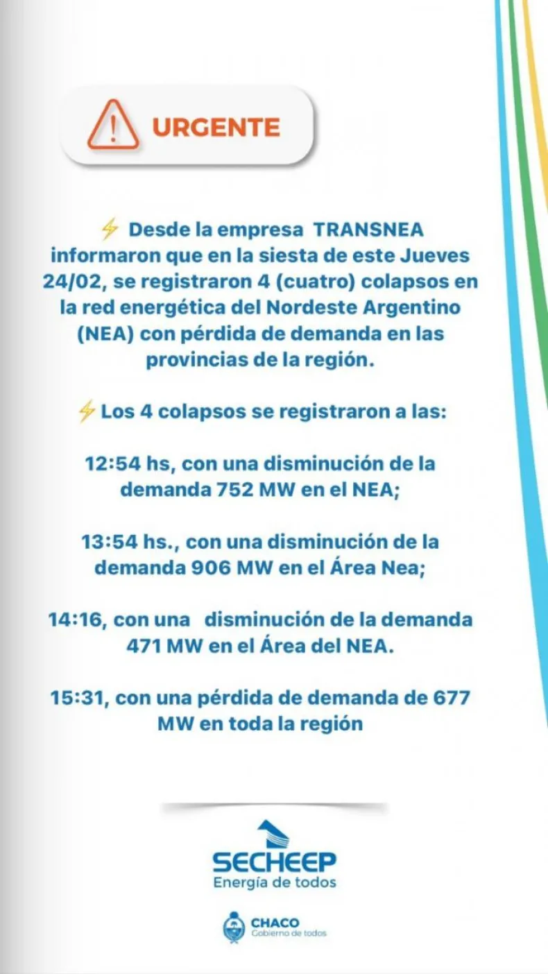 SECHEEP informó que durante la siesta de este jueves se dieron 4 colapsos energéticos: afectó al NEA
