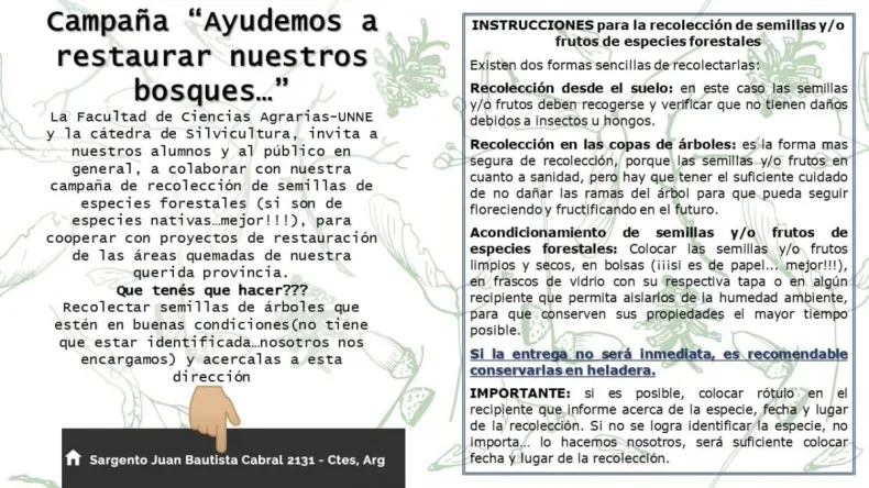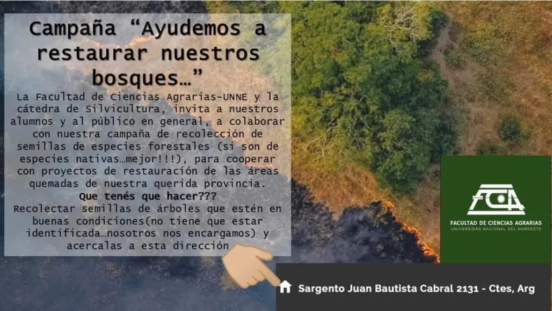 "Ayudemos a restaurar nuestros bosques", es el nombre de la campaña lanzada desde la Facultad de Ciencias Agrarias, y puntualmente desde la Cátedra de Silvicultura, para recolectar semillas de árboles forestales, a fin de cooperar con proyectos de restauración de las áreas quemadas de la provincia. "¡Si son de especies nativas mejor!", señala la publicación que hicieron en las redes sociales de la Unidad Académica.