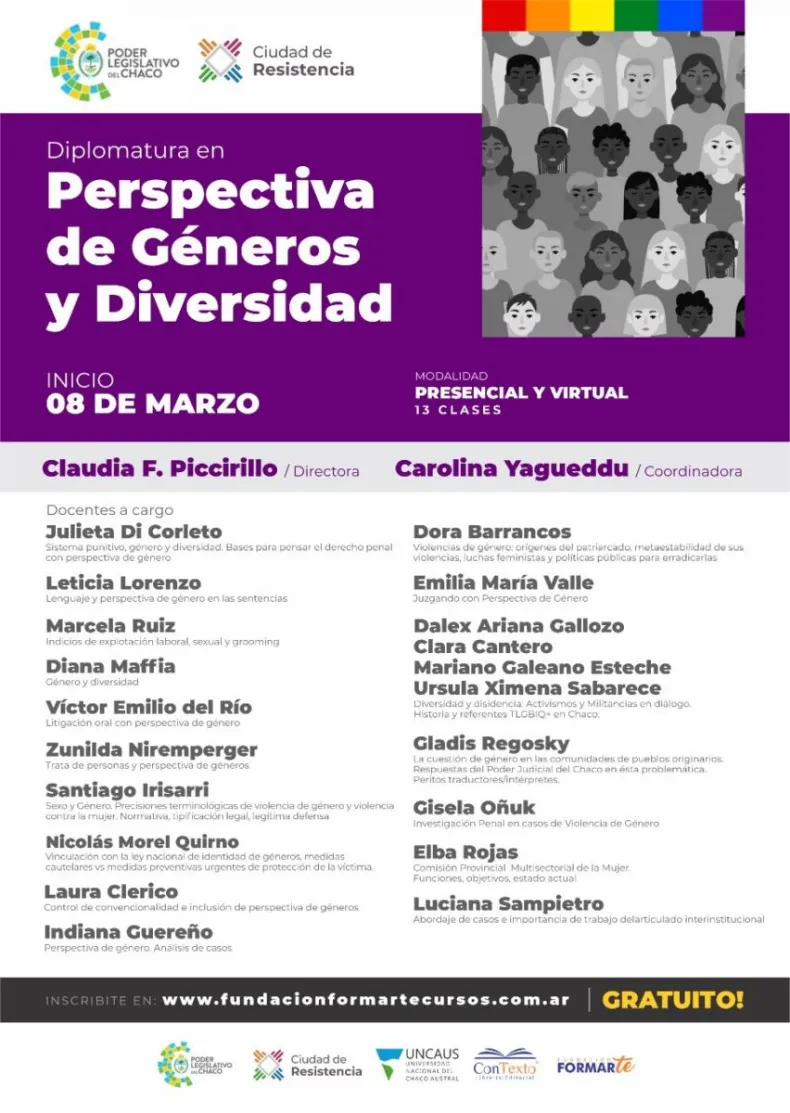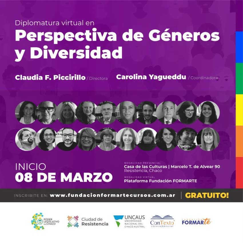 El próximo 8 de marzo se iniciará la Diplomatura en Perspectiva de Géneros y Diversidad, organizada por la fundación Formarte y con el auspicio de la Cámara de Diputados del Chaco y el Municipio de Resistencia, Uncaus y Editorial Contexto. El primer encuentro será presencial en la Casa de las Culturas, en la esquina de calles Marcelo T. de Alvear y Mitre, a partir de las 17 horas y luego continuará de manera virtual.