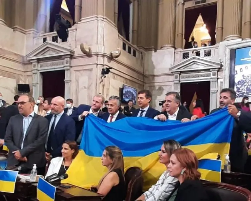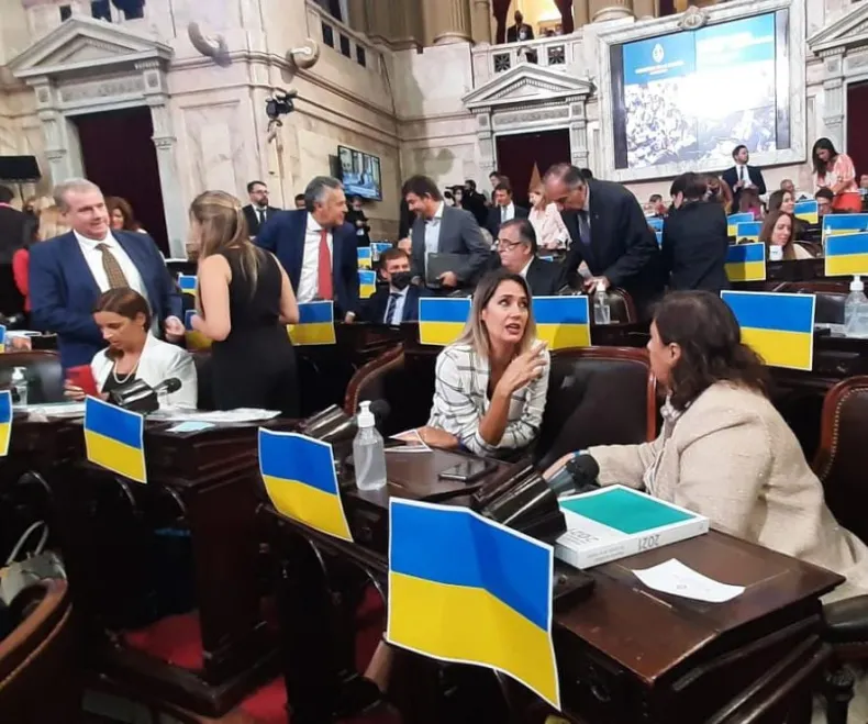 Carteles con los colores de Ucrania por delante de las bancas también fueron vistos además de las banderas para mostrar su descontento con la política exterior empleada por el gobierno de Alberto Fernández en el conflicto bélico que afecta a Europa.