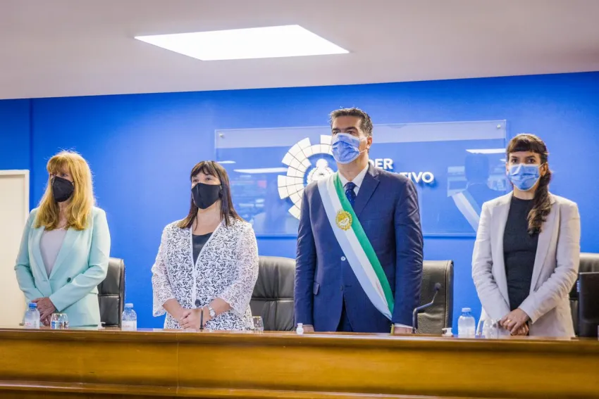 El mandatario estuvo acompañado por la vicegobernadora, Analía Rach Quiroga; la presidenta de la Legislatura, Élida Cuesta; la presidenta del Superior Tribunal de Justicia, Emilia Valle; diputadas y diputados, bomberos de Puerto Tirol y Margarita Belén, docentes y representantes de la economía popular, y demás autoridades que siguieron la apertura por videoconferencia.