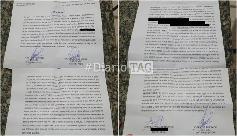 En el escrito al que pudo acceder DIARIO TAG, sostiene que Bernardis "observó el ingreso de Omar Judis, quien es ex rector de la Institución, al sector de la radio con el fin de salir al aire en vivo, lo que motivó que le dijera que estábamos en cadena nacional y que luego podría ingresar", y se agrega: "Seguido a esto le preguntó cuál era el motivo por el cual quería salir al aire, diciendo de forma exaltada y agresiva que quería un derecho a réplica, ya que desde esa radio se estaba hablando mal de él". La productora explicó que estos"dichos que no son ciertos, ya que tenemos prohibido por parte del rectorado al cual nombrarlo por algún medio al señor Judis".
