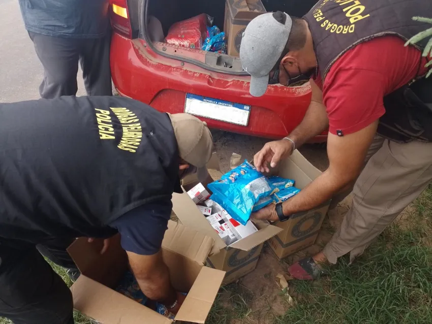 En primera instancia cerca de las 16 horas se ubicaron en colonia Sur por Ruta Provincial 90, a 5 kilómetros del acceso a la ciudad, donde demoraron el paso de un automóvil Renault Sandero, color rojo, conducido por un hombre de 39 años de edad, a quien se le registró el baúl del rodado encontrando dentro de una caja un total de 16 cartones de cigarrillos marca Rodeo.