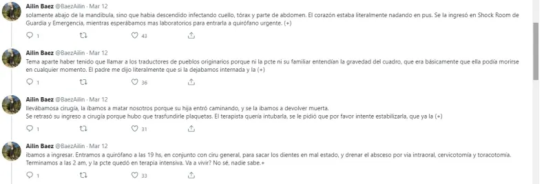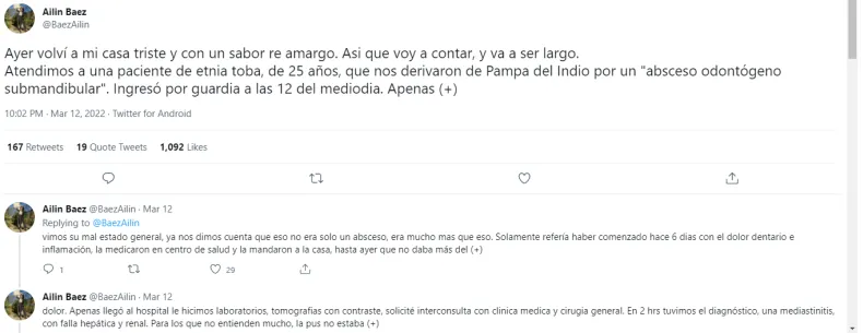 Ayer, una usuaria de Twitter, llamada Ailín Báez (@BaezAilin), que es odontóloga especialista en cirugía y traumatología bucomaxilofacial, hizo un hilo relatando como una paciente de 25 años de la etnia toba, proveniente de Pampa del Indio, fue ingresado al Hospital Perrando por un "absceso odontógeno submandibular" que se complicó y derivó en una "mediastinitis con falla hepática y renal".