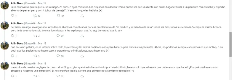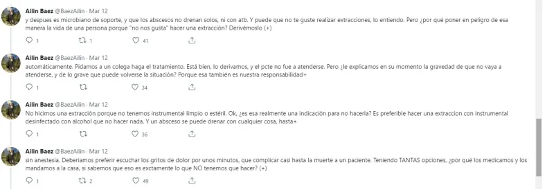 En igual sentido, sostuvo: "Atendemos abscesos complicados por esa problemática de ‘lo medico y lo mando a la casa’ todos los días, todas las semanas. Siempre la misma bronca, pero la de ayer no fue solo bronca, fue tristeza. Y les explico por qué. Yo sé, y de verdad que lo sé que, en salud pública, en el interior, sobre todo, los centros y las salitas no tienen nada para hacer o para darles a los pacientes. Ahora, no podemos siempre excusarnos en ese motivo, o en decir que los pacientes no hacen caso al tratamiento o indicaciones, para hacer una mea culpa de nuestra negligencia como odontólogos. ¿Por qué si estudiamos tanto por nuestro título, hacemos lo que sabemos que no tenemos que hacer? ¿Por qué no drenamos un absceso o hacemos una extracción?".