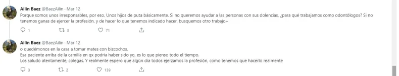 La odontóloga amplió sus comentarios brindando alternativas para tratar a los pacientes que llegan con estas dolencias: "No hicimos una extracción porque no tenemos instrumental limpio o estéril. Ok, ¿es esa realmente una indicación para no hacerla? Es preferible hacer una extracción con instrumental desinfectado con alcohol que no hacer nada. Y un absceso se puede drenar con cualquier cosa, hasta sin anestesia. Deberíamos preferir escuchar los gritos de dolor por unos minutos, que complicar casi hasta la muerte a un paciente. Teniendo tantas opciones, ¿por qué los medicamos y los mandamos a la casa, si sabemos que eso es exactamente lo que no tenemos que hacer? Porque somos unos irresponsables, por eso. Unos hijos de puta básicamente. Si no queremos ayudar a las personas con sus dolencias, ¿para qué trabajamos como odontólogos? Si no tenemos ganas de ejercer la profesión, y de hacer lo que tenemos indicado hacer, busquemos otro trabajo o quedémonos en la casa a tomar mates con bizcochos. Esa paciente arriba de la camilla que podría haber sido yo, es lo que pienso todo el tiempo".