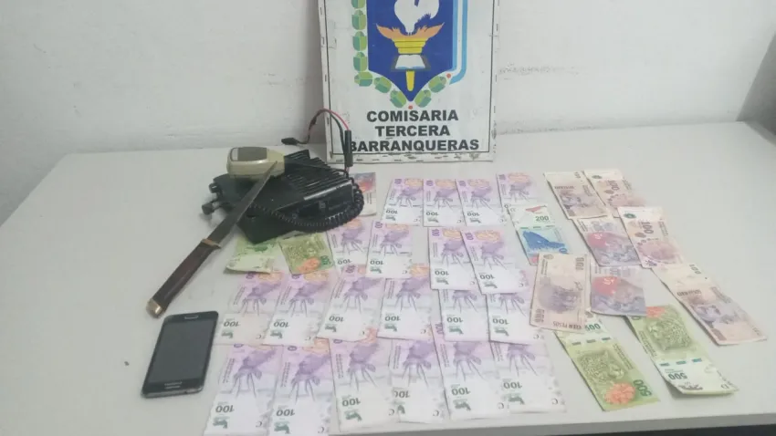 Esta madrugada en Barranqueras, en la intersección de la avenida Edison con la calle Tatane, tres delincuentes se hicieron pasar por pasajeros y, a punta de chuchillo, le robaron $5200, la radio base y un celular al chofer de un remis. Minutos mas tarde, a unas cuadras del lugar del hecho, agentes policiales pudieron detener a los sujetos, de los cuales uno de ellos llevaba bochitas de cocaina.