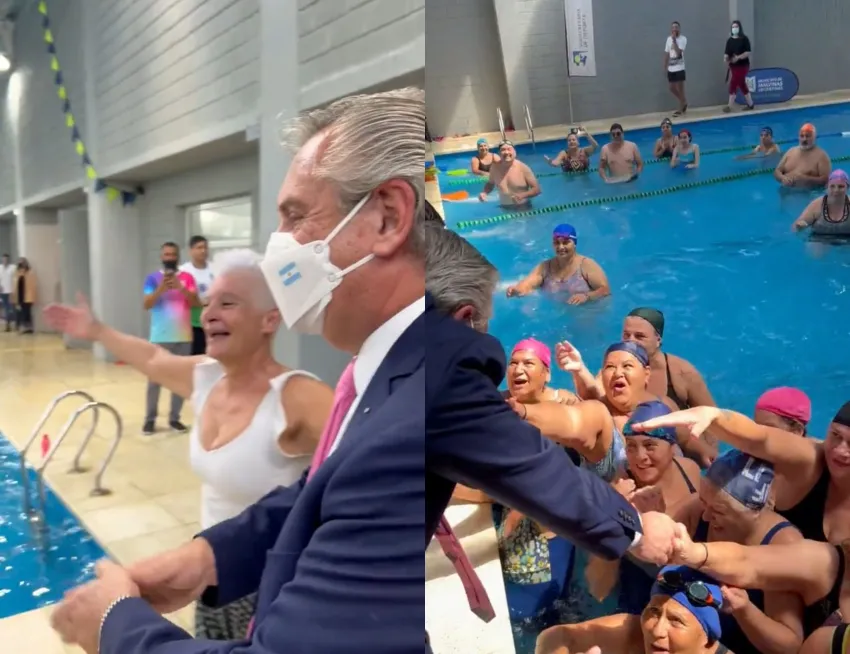 Alberto Fernández visitó una clase de gimnasia acuática y una persona advirtió: "No lo tiren al agua, eh"