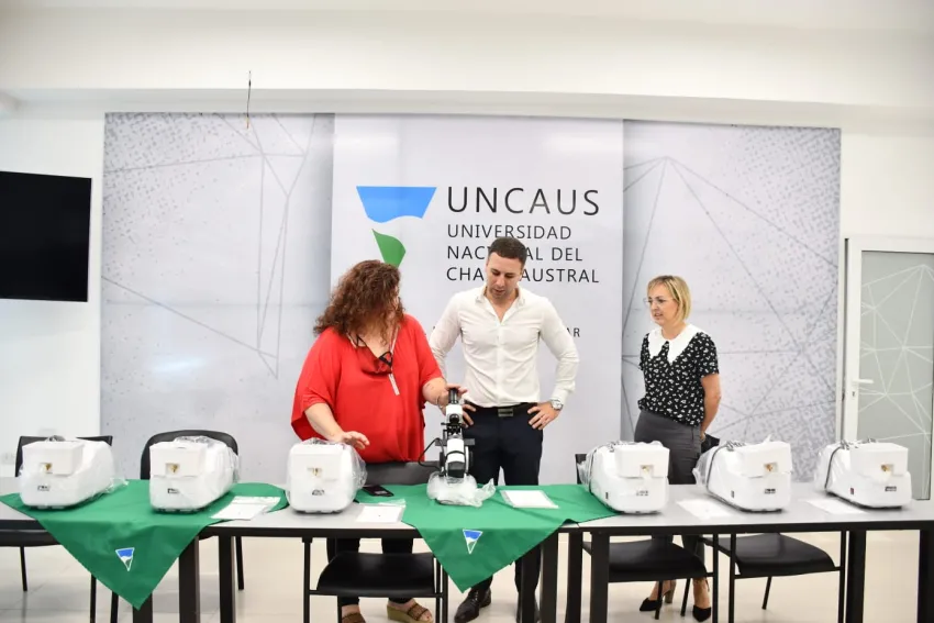 El rector de la Universidad Nacional del Chaco Austral, Germán Oestmann, junto a la delegada Rectoral, Yanina Spitzer, entregaron equipamientos a la dirección de la carrera de Óptico Técnico Contactólogo, que se dicta con modalidad presencial, para que los estudiantes puedan afianzar la práctica de calibrado y armado de anteojos.