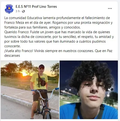 Desde la cuenta de Facebook de la E.E.S. Nº11 "Lino Torres" se realizó una publicación donde la comunidad educativa de la institución se refirió con profundo pesar al fallecimiento de Franco Meza en el día de ayer. "Rogamos por una pronta resignación y fortaleza para sus familiares, amigos y conocidos", se expresaron.