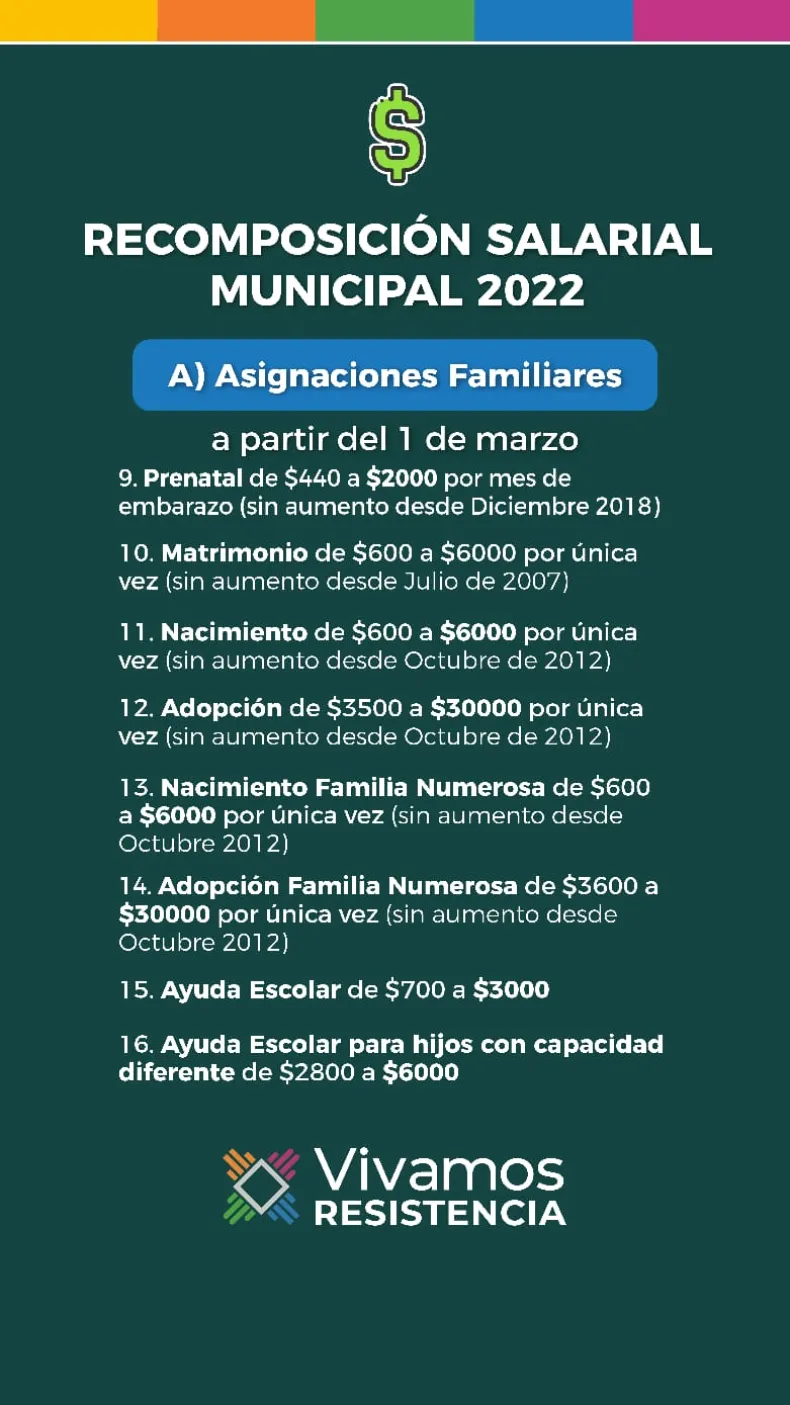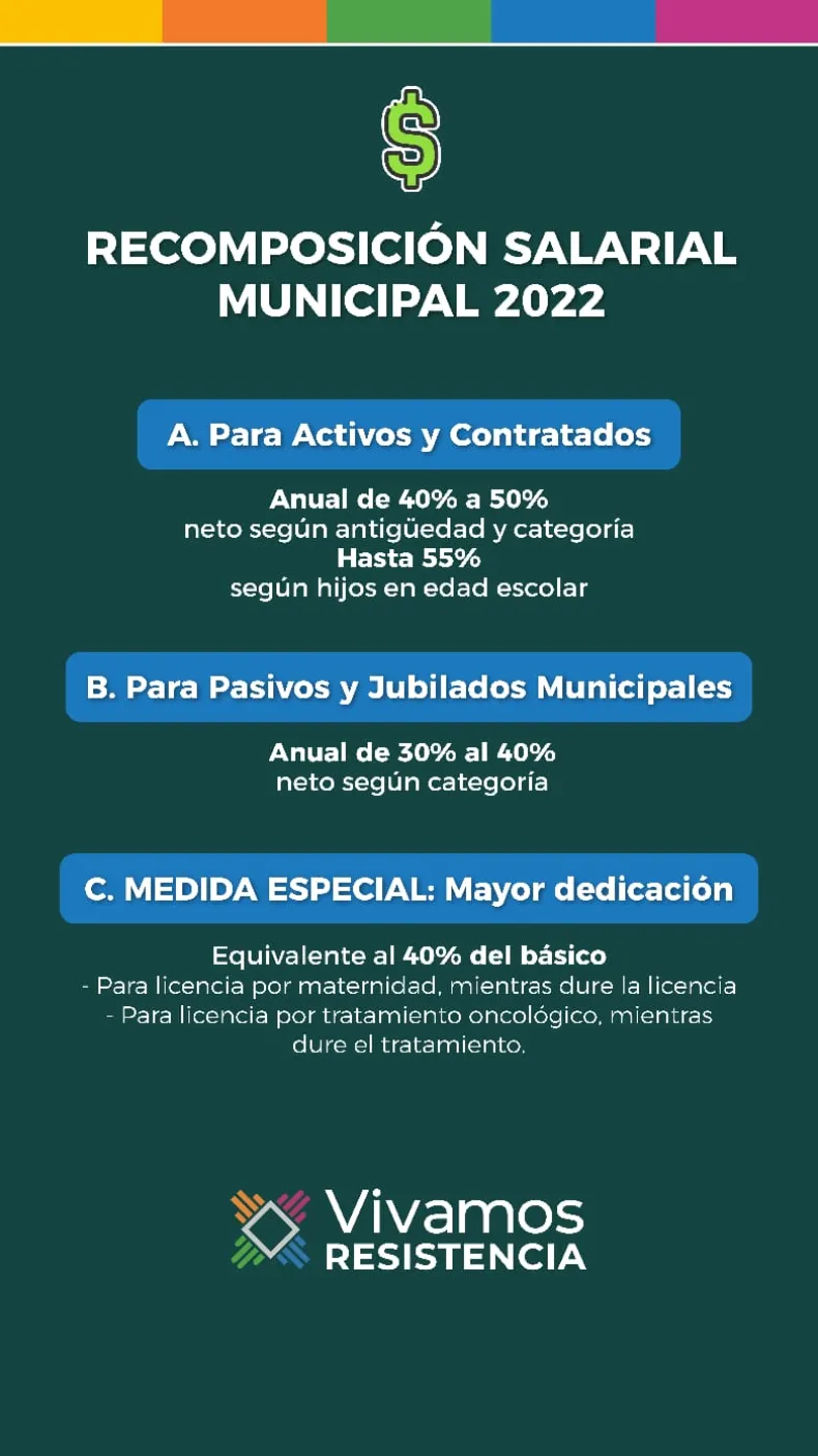 "Vamos a tener un aumento salarial que en el año le va a significar al trabajador activo entre un 40% y un 50% en el año. En algunos casos va a llegar hasta el 55% de acuerdo a la cantidad de hijos en edad escolar que tenga un trabajador. La mayor parte de este aumento va a ser destinado a los jubilados porque tendrán un aumento de entre un 35% y 40%. Se va a dividir en 3 etapas, de las 3 etapas vamos a tener 4 conceptos de distribución y una quinta medida especial", expresó el intendente.