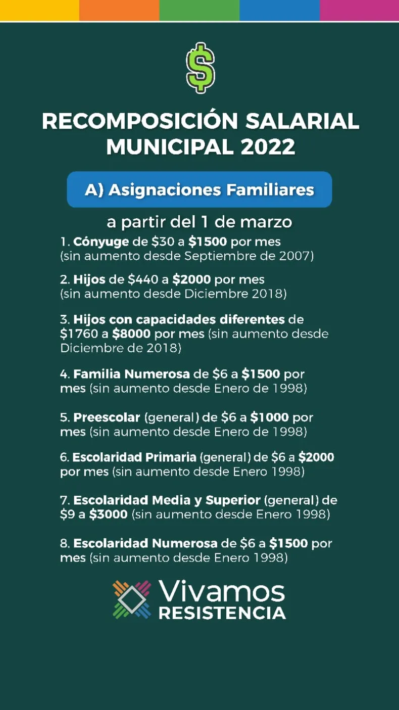 - Asignaciones familiares: cónyuge se abonará $1.500 por mes, hijos se abonará $2.000 por mes, hijo con capacidad diferente $8.000 por mes, familia numerosa pasará a abonar $1.500 por mes, niño en prescolar pasará a $1.000 por mes, hijo con escolaridad primaria pasará a $2.000, escolaridad media o superior pasará a $3.000 por mes, escolaridad numerosa pasará a $1.500, prenatal pasará a $2.000 por mes, matrimonio y nacimiento (única vez) $6.000, entre otros conceptos.