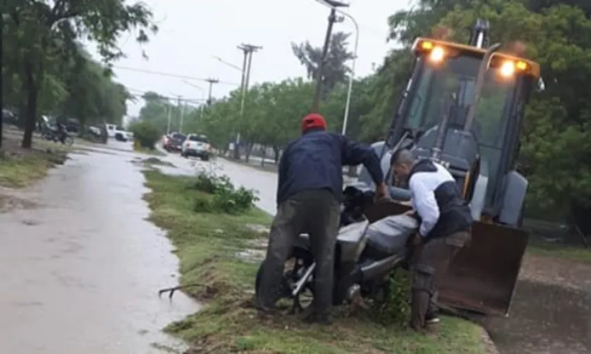 Un maquinista de la Municipalidad tuvo que auxiliar al joven. Debido a que la calle estaba cubierta de agua el conductor decidió caminar por la vereda con la moto al lado y en esas circunstancias terminó cayendo con el rodado dentro del pozo lleno de agua.