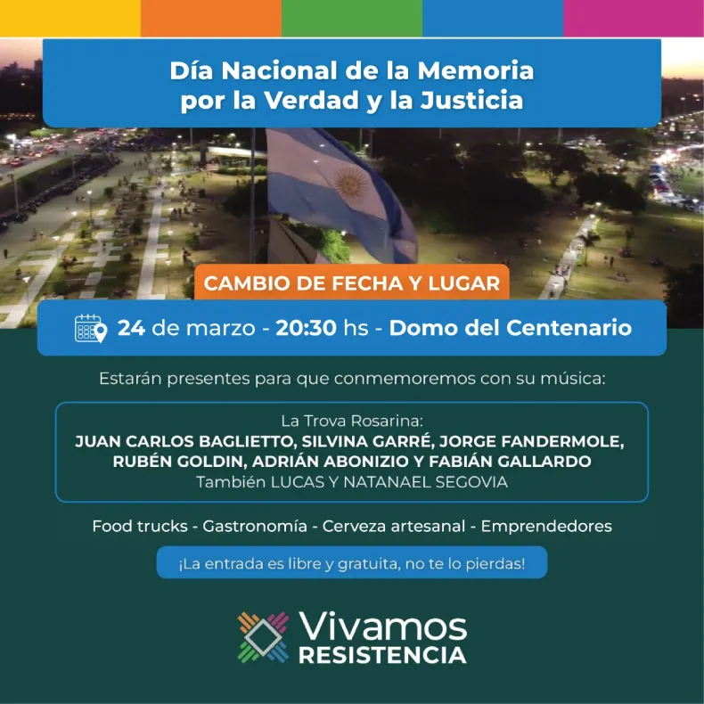 Debido a las inclemencias climáticas que acontecieron en las últimas horas y las que se pronostican, el Festival de la Ciudad en conmemoración por el Día de la Memoria por la Verdad y la Justicia se cambió de lugar y se realizará en el Domo del Centenario de Resistencia este jueves 24 de marzo a partir de las 20:30 horas.