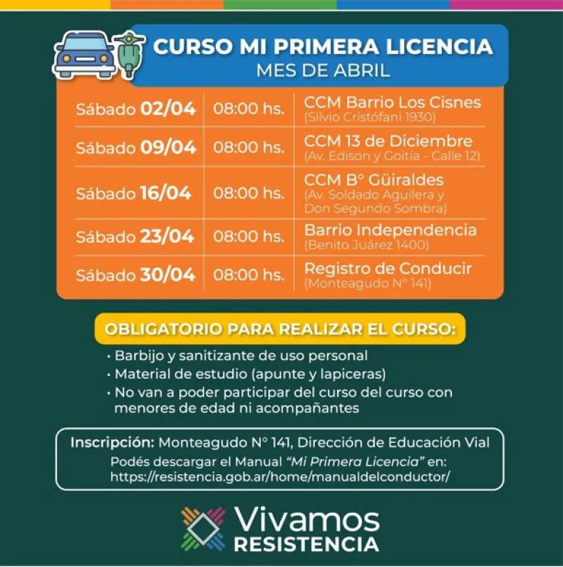 La Municipalidad de Resistencia reinicia en el mes de abril el programa "Mi Primera Licencia", donde se brindarán cursos de capacitación en distintos centros comunitarios municipales (CCM) y otras dependencias comunales para poder acceder a la licencia de conducir.