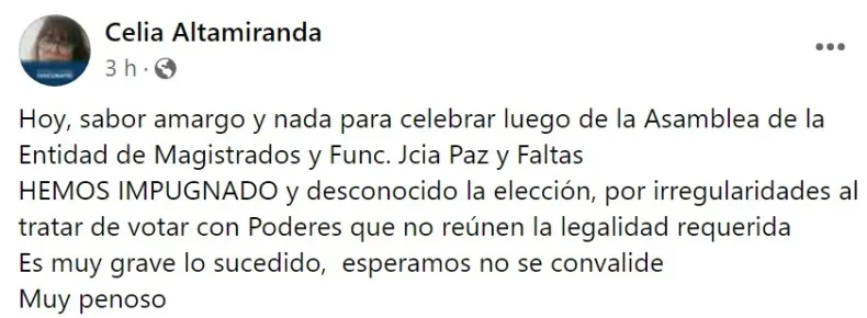 La jueza de faltas de Sáenz Peña, Celia Altamiranda, quien asistió a la votación, habló con DIARIO TAG y sostuvo que "la verdad es que no resultó electa la fórmula que están publicitando", en referencia al oficialismo, sino que "por impugnación de dos votos por poder resultó electa la otra fórmula", refiriéndose a la oposición.