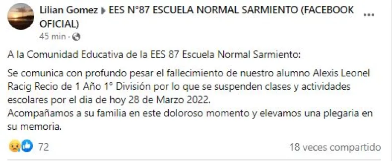 Acompañamos a su familia en este doloroso momento y elevamos una plegaria en su memoria, escribió la administradora de la EES N!87 Escuela Normal Sarmiento, Lilian Gomez.