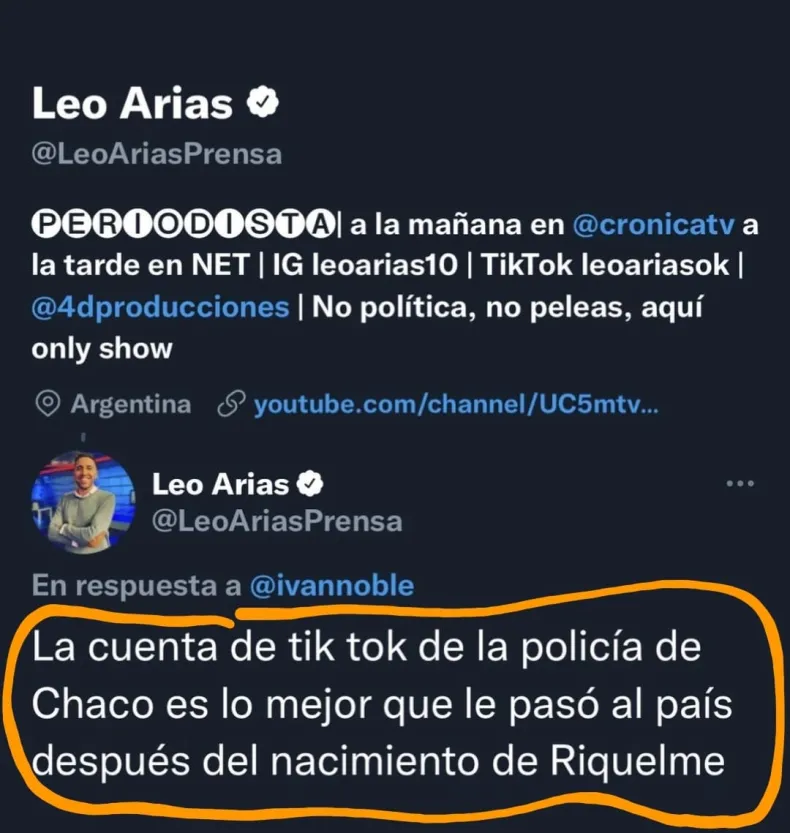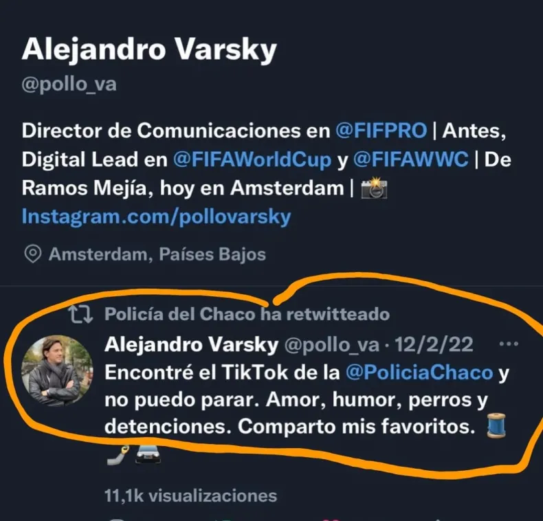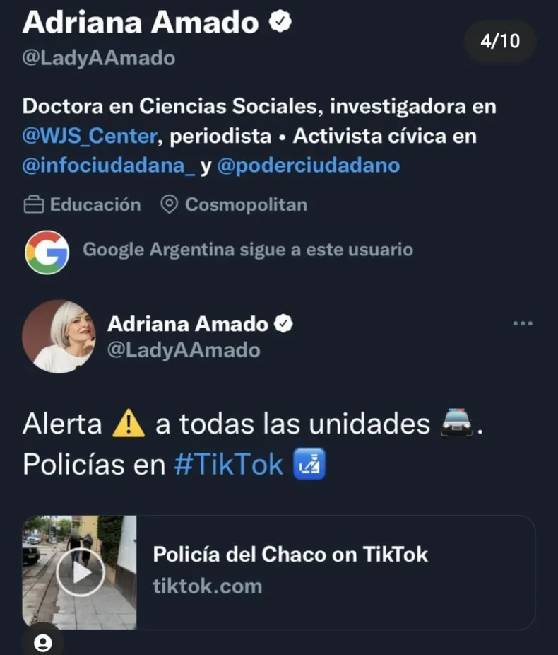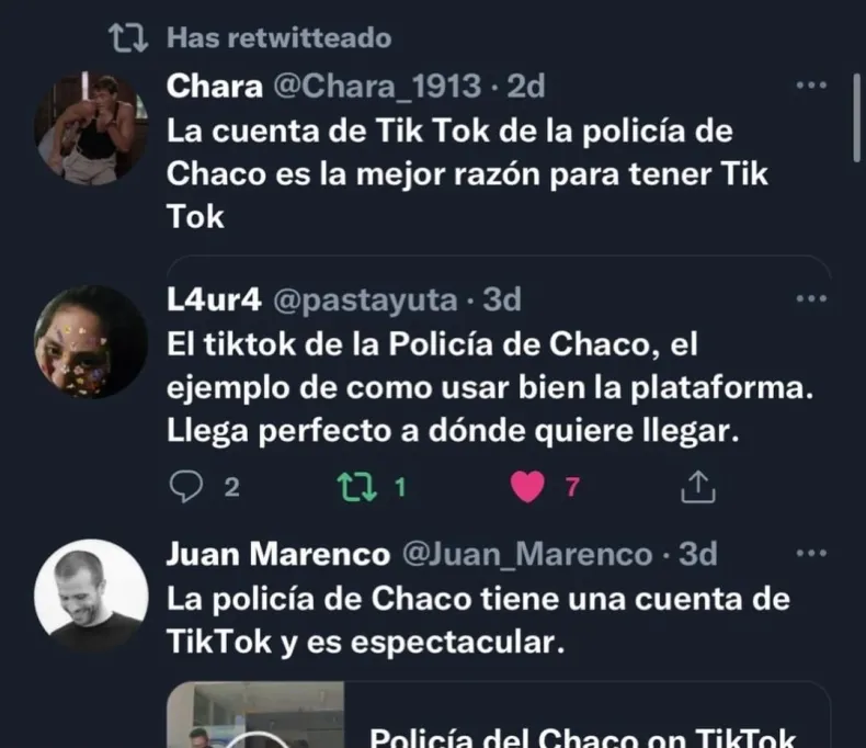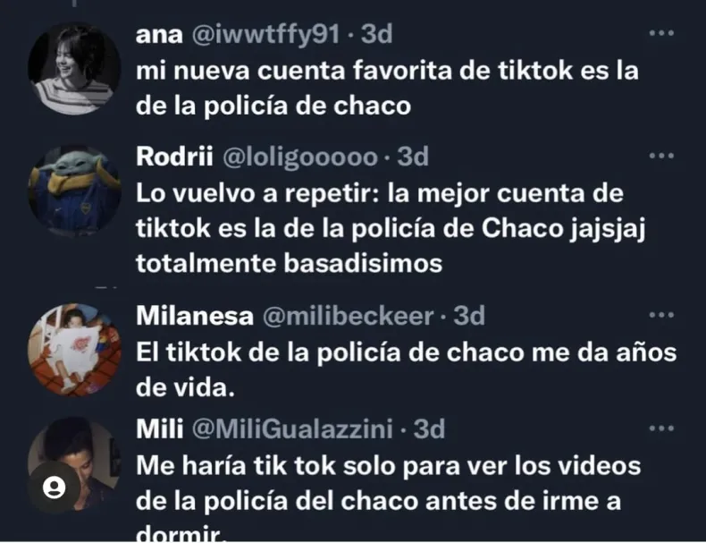 Todo comenzó cuando cuenta la cuenta de TikTok llegó a twitter, y desde ahí el usuario Alejandro Varsky presentó el hallazgo a sus seguidores mediante un hilo que obviamente no tardó en viralizarse. "Encontré el TikTok de la Policía de Chaco y no puedo parar. Amor, humor, perros y detenciones", escribió.