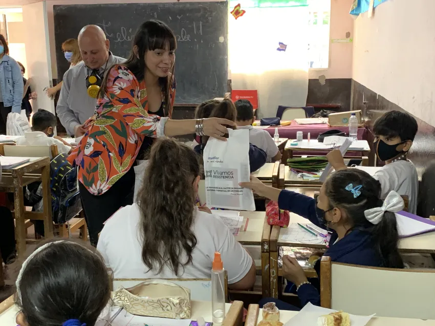 La secretaria municipal de Desarrollo Humano e Identidad, Laura Balbis, entregó 620 kits escolares para los alumnos y alumnas de la escuela N°343 en nombre del intendente de Resistencia, resaltando que "estos kits escolares se les brinda a todos los alumnos y alumnas de la ciudad, a quienes se arribó gracias a un convenio con el Ministerio de Educación provincial".