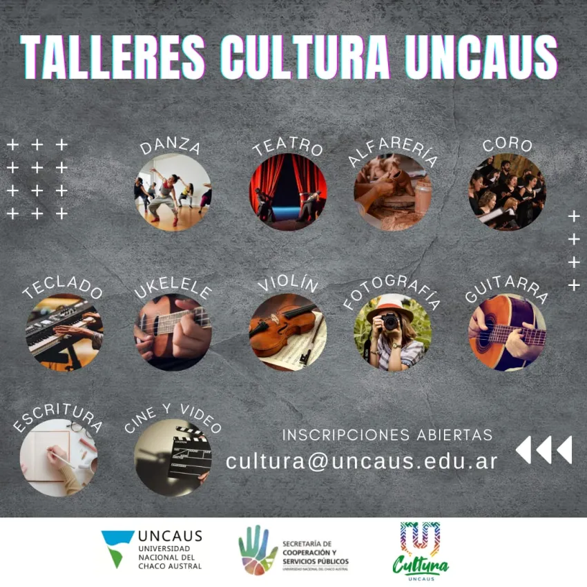 La Universidad Nacional del Chaco Austral (UNCAUS), a través de la Secretaria de Cooperación y Servicios Públicos- Área de Cultura, abrió inscripciones para los siguientes talleres culturales: fotografía, alfarería, guitarra, violín, teclado, danzas, cine y video, ukelele, escritura creativa, coro universitario, teatro universitario.