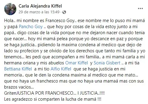 Carla Kiffel es la mamá del pequeño fallecido, que un mes antes de entrar en trabajo de parto había perdido a su marido. La causa está caratulada como "Homicidio Culposo" y la denunciante pedirá la pena máxima y la inhabilitación profesional al médico que está implicado.