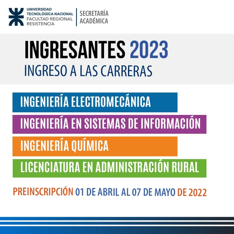 Desde este viernes 1 de abril, y hasta el 7 de mayo, inclusive, se encuentra abierta la preinscripción online al Primer Turno del Seminario Universitario para ingresar en 2023 a las carreras de grado que se dictan en la Facultad Regional Resistencia de UTN.