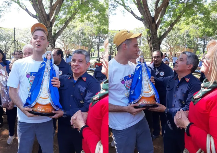 Luego de aterrizar en la provincia de Corrientes el día viernes, el influencer, Santiago Maratea, este sábado se encontró con los Bomberos Voluntarios de Itatí, quienes le regalaron una imagen de la Virgen.
