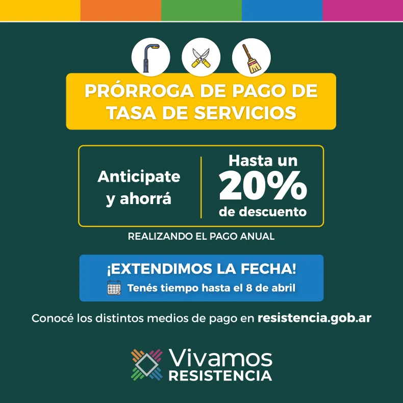 Resistencia informa que continúa vigente, hasta el viernes 8 de abril, la prórroga para sumarse a los beneficios que contempla el pago anual de Tasa de Servicios. Quienes abonen antes de la fecha estipulada pueden acceder a un descuento del 10% por el abono anticipado del período 2022 y otro 10% para aquel contribuyente que también pagó de forma anticipada este tributo en 2021.