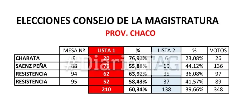 Asimismo, según se pudo saber en Chaco la Lista 1 sobrepasó en las mesas a la Lista 2 con 72 votos.