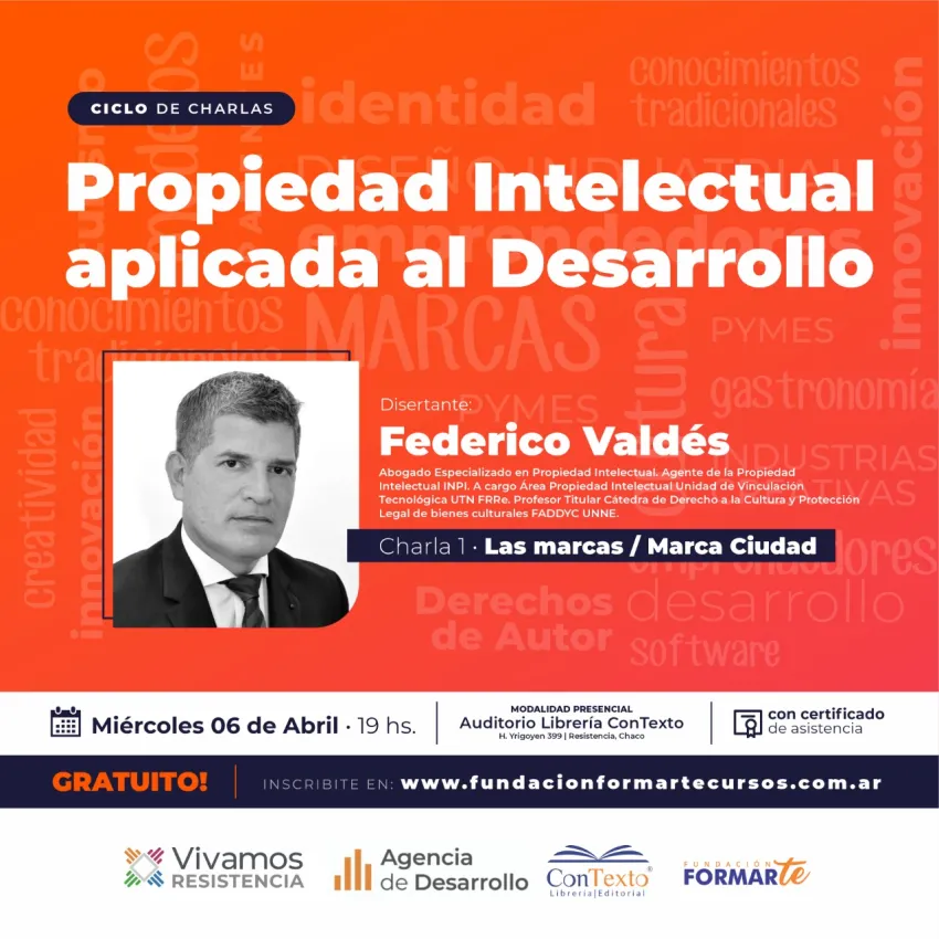 Este miércoles 6 de abril, a las 19 horas, en el auditorio de la Librería Contexto, situada en Yrigoyen 399, se llevará a cabo la charla "Propiedad intelectual aplicada al desarrollo" a cargo de Federico Valdés, quien está a cargo del Programa de Propiedad Intelectual impulsada a través de la Agencia de Desarrollo de Resistencia.