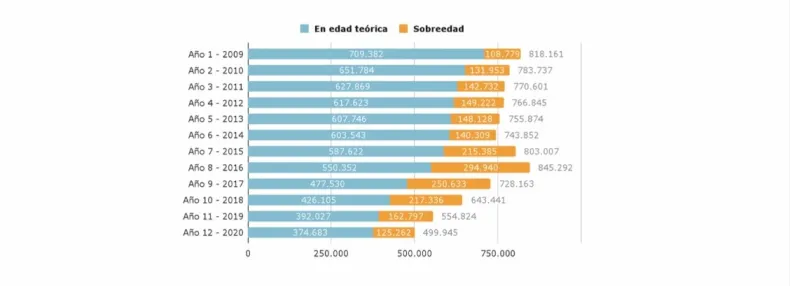Los años 7 y 8 contemplan el pico de sobre edad, allí sucede la transición de primaria a secundaria, y tiene como consecuencia un descenso posterior que grafica el abandono que realizan los estudiantes en esas etapas. También demuestra que el abandono es progresivo y que muchos alumnos quedan en el sistema escolar tras repetir de año.