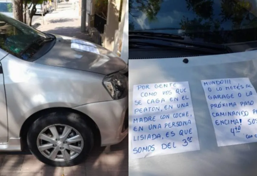 Fue así que, Laura Rodríguez Torres tomó la decisión de sacarle una foto a unas cartulinas que tenían un claro mensaje para un conductor, de parte de una vecina desconocida. "Por gente como vos que se caga en el peatón, en una madre con un coche, en una persona lisiada, es que somos del tercer mundo", escribió la vecina en una nota que dejó pegada en el vehículo al infractor.