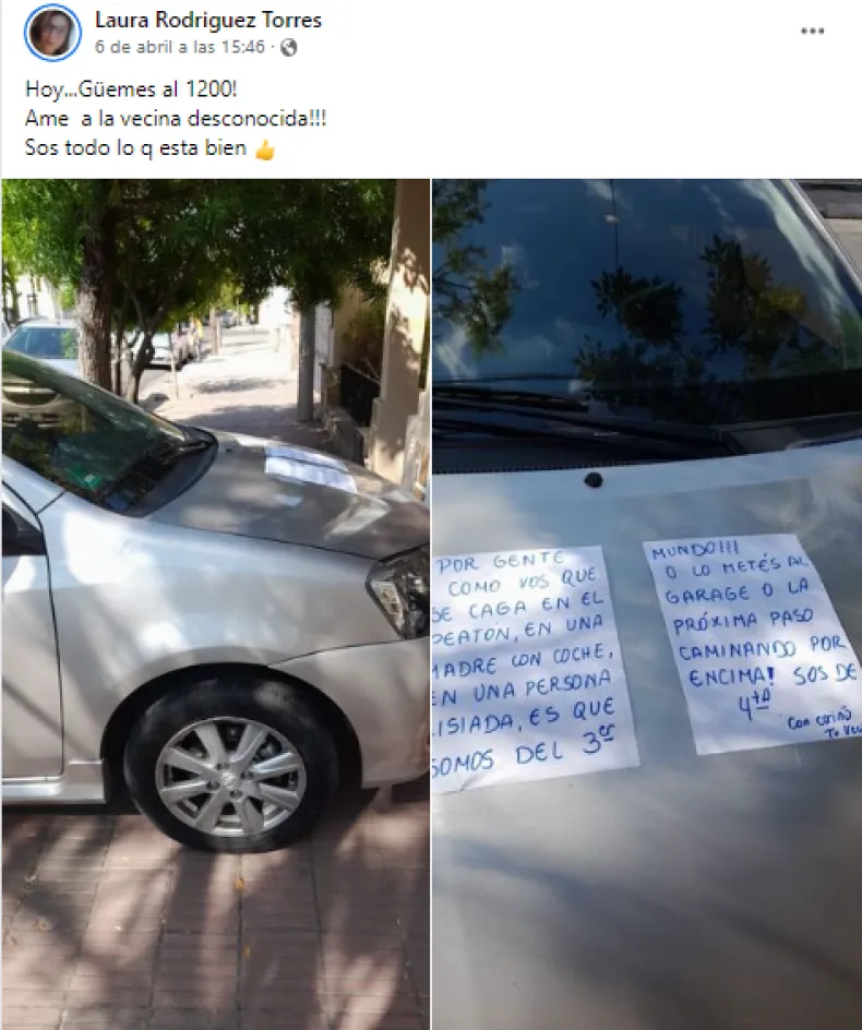"O lo metés al garage o la próxima paso caminando por encima! Sos de 4ta. Con cariño, tu vecina", finalizó la mujer.