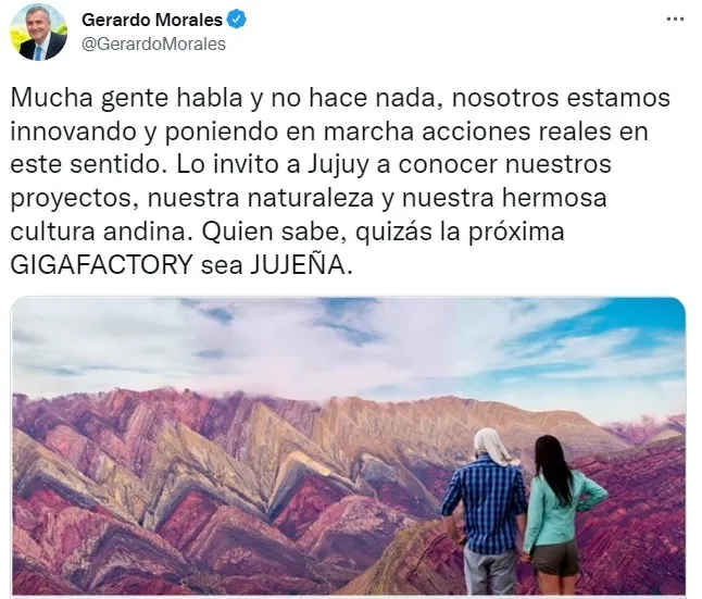 "Mucha gente habla y no hace nada, nosotros estamos innovando y poniendo en marcha acciones reales en este sentido. Lo invito a Jujuy a conocer nuestros proyectos, nuestra naturaleza y nuestra hermosa cultura andina. Quien sabe, quizás la próxima GIGAFACTORY sea JUJEÑA", aseveró.