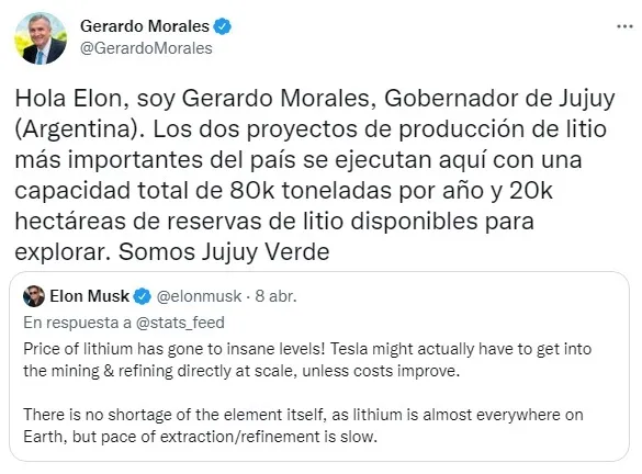 "Hola Elon, soy Gerardo Morales, gobernador de Jujuy (Argentina). Los dos proyectos de producción de litio más importantes del país se ejecutan aquí con una capacidad total de 80k toneladas por año y 20k hectáreas de reservas de litio disponibles para explorar. Somos Jujuy Verde", indicó Morales.