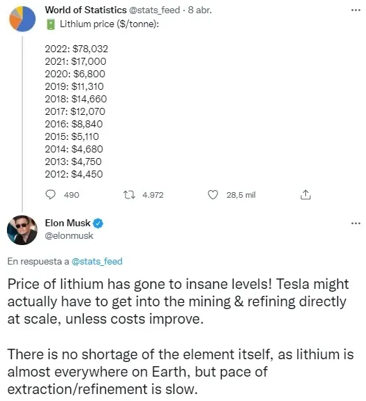 "¡El precio del litio ha llegado a niveles demenciales! Tesla podría tener que ingresar a la minería y la refinería directamente a escala, a menos que mejoren los costos", tuiteó el dueño de Tesla y SpaceX.