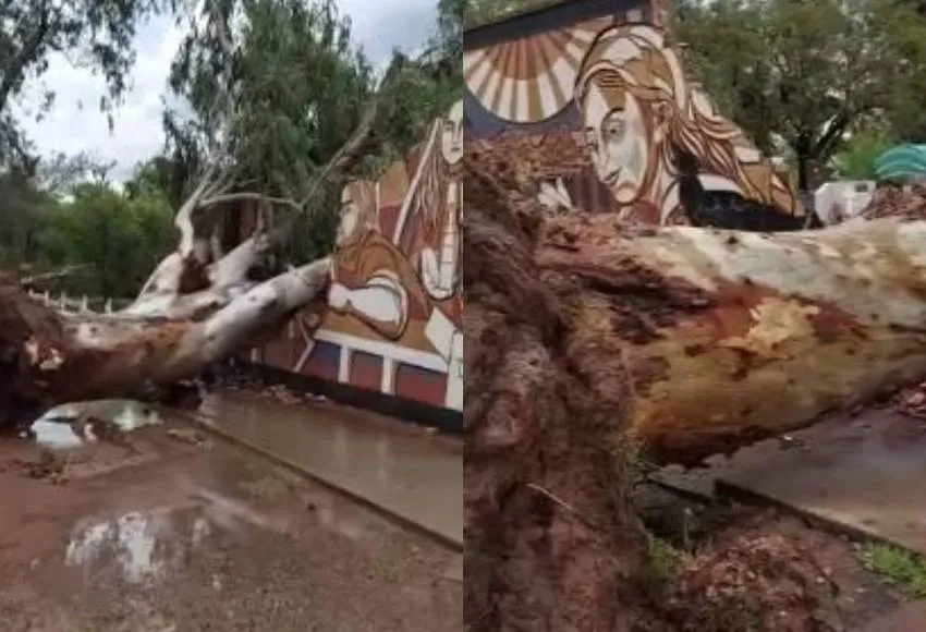 Esto fue durante la madrugada de este domingo en el cementerio de Juan José Castelli, arboles históricos que estaban emplazados al frente del mural del cementerio fueron derribados por completo por las fuertes tormentas.