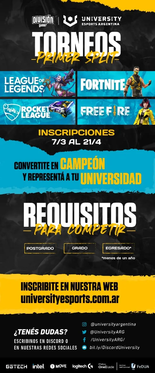 Las inscripciones se realizan hasta el 21 de abril, a través de la página web de University Argentina: http://www.universityesports.com.ar. Para consultas comunicarse con @universityargentina (instagram), @UniversityARG, bit.ty/DiscordUniversity (Discord).