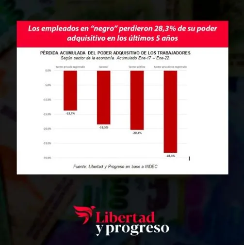 Así lo revela un análisis del centro investigativo "Libertad y progreso" que señala que el sueldo promedio de la economía argentina tanto público, privado formal y privado informal cayó un 18,5%. Los empleados más afectados fueron los trabajadores del sector privado no registrado, donde la pérdida acumulada fue de 28,3%.