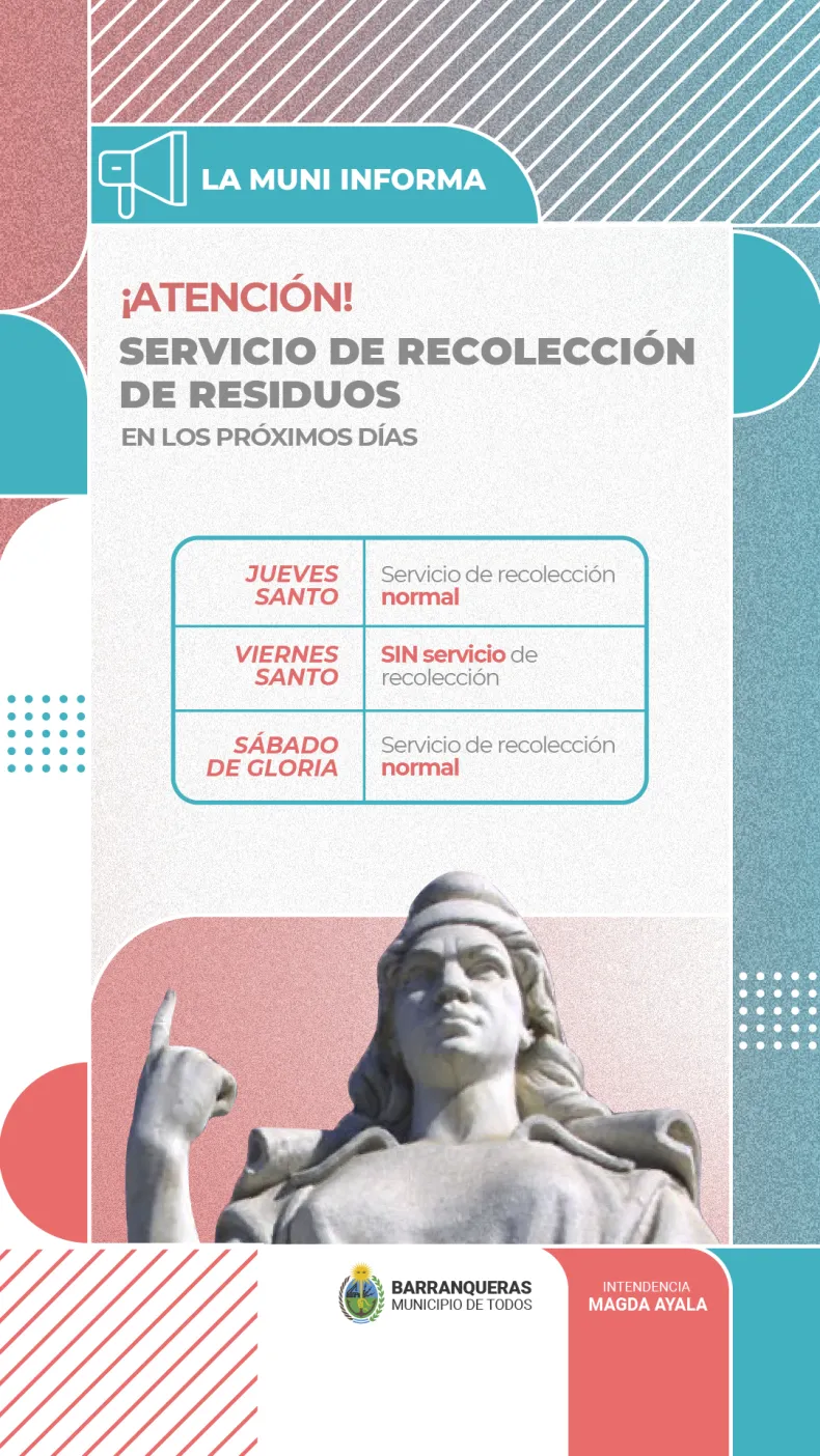Desde el municipio de Barranqueras informan que durante este fin de semana extra largo por ser Semana Santa, el servicio de recolección se verá con algunas modificaciones: