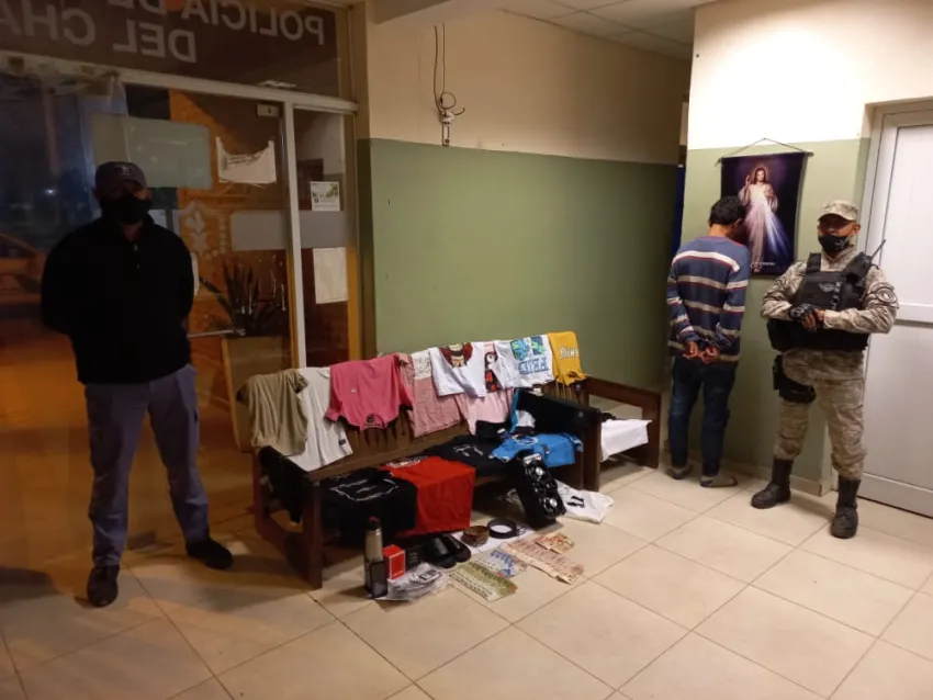 Personal del Grupo Motorizado, en conjunto con efectivos de la Comisaria de Quitilipi con las imágenes aportadas por las cámaras de seguridad del lugar lograron identificar al supuesto autor del hecho y procedieron la demora de H.M.P de 28 años, quien tenía en su poder $7.800, un termo Lumilagro, un par de ojotas, dos perfumes para hombre, dos pares medias, cinto, un parlante portátil, 18 remeras y un eléfono celular marca MOTOROLA, sin tarjeta de memoria.