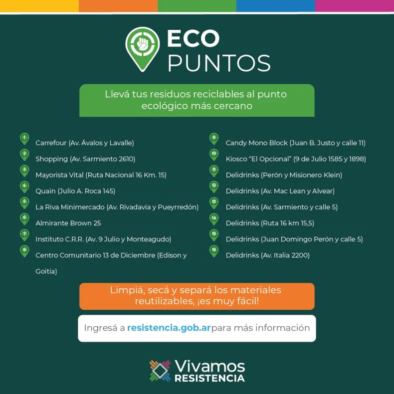 El municipio de Resistencia distribuyó en diferentes locales comerciales, Puntos Ecológicosdonde los vecinos y vecinas pueden acercar los residuos sólidos urbanos reciclables a fin de colaborar con la recolección, tratamiento y disposición final de los mismos. La iniciativa tiene como objetivo aportar a través del reciclaje a la calidad ambiental de la ciudad.
